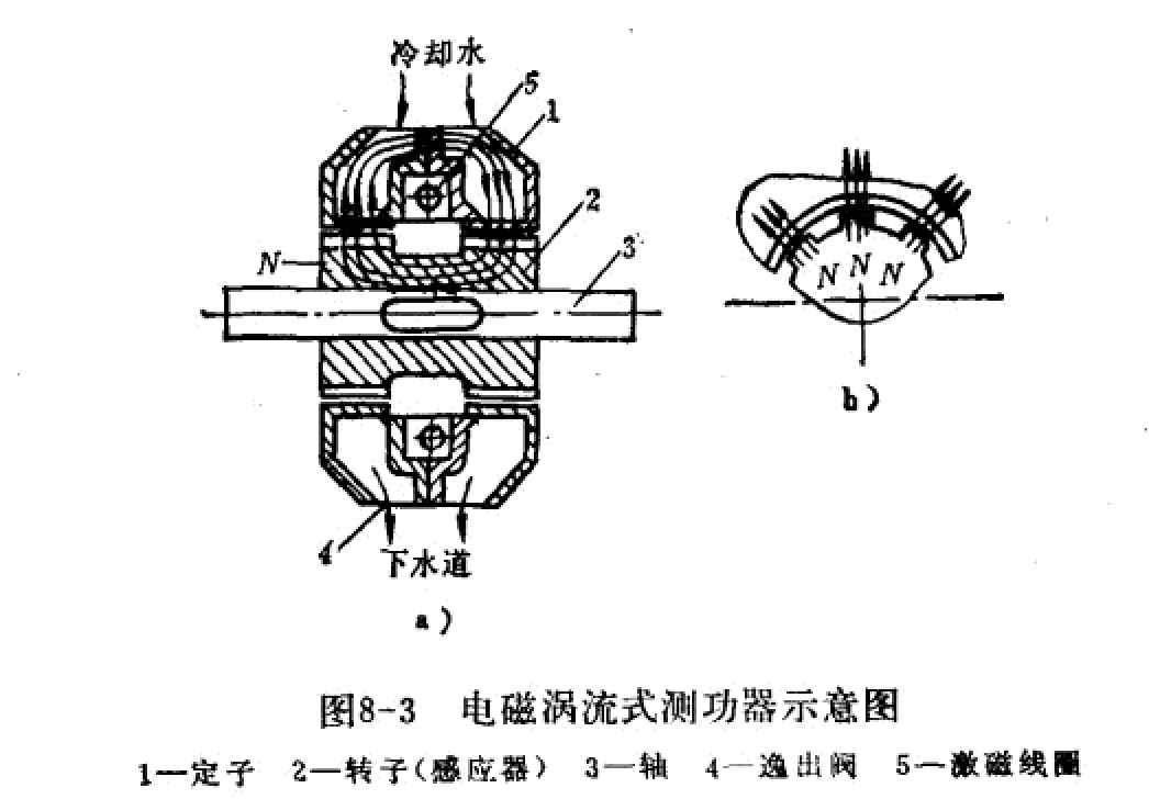 电磁涡流式测功器的结构,如图8-3所示。与试验齿轮箱输出轴相联的轴3上,装有高导磁率的钢制转子(感应器)
